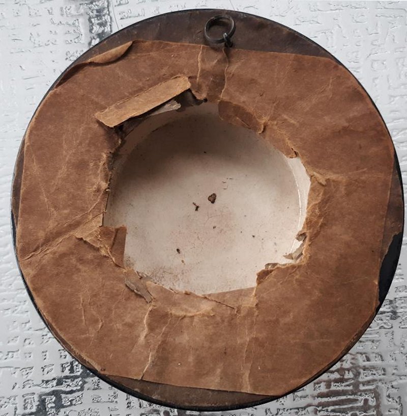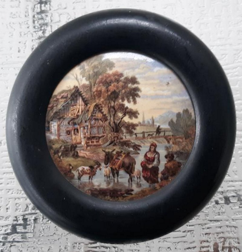 A framed Prattware pot lid pot lid showing a bucolic scene with farm animals and farmer’s wife standing in a stream. Circa 1880. The frame measures 6″ in diameter and the lid measures 3.75″ in diameter. The lid is in good condition, the frame is a little blemished.