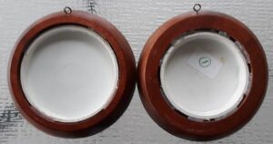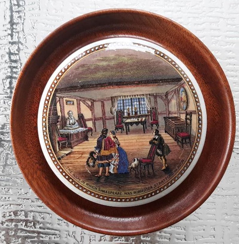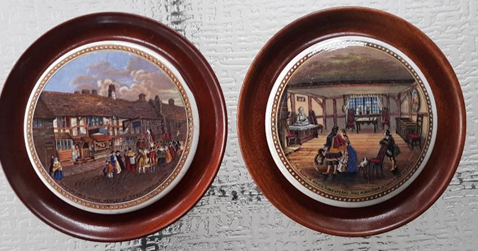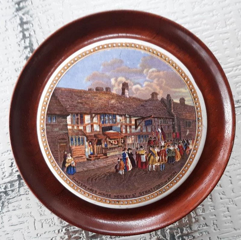 A pair of framed Prattware pot lids with Shakespeare Connections. The first shows Shakespeare’s house in Henley St, Stratford upon Avon, and the second is titled “The room in which Shakespeare was born 1564, Stratford upon Avon”. Both frames measure 5.75″ in diameter and the lids measure 4.25″ in diameter. Nice condition with good quality frames.