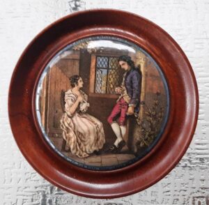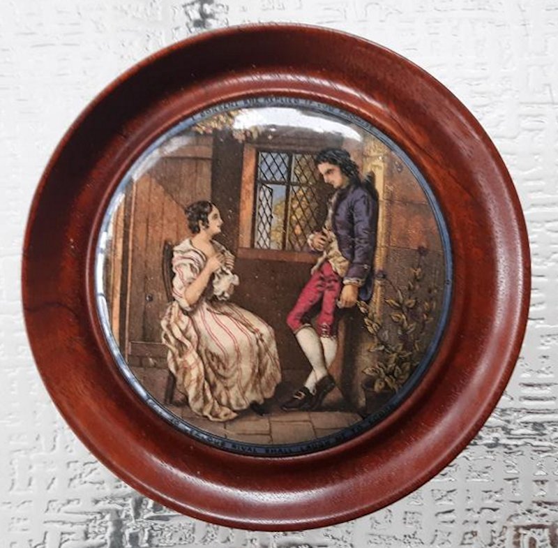 A framed Prattware pot lid showing a romantic scene of a man and woman talking . it has an inscription “I consent