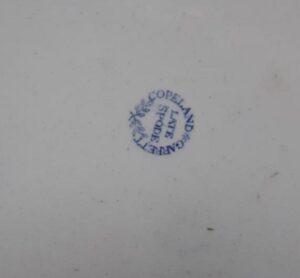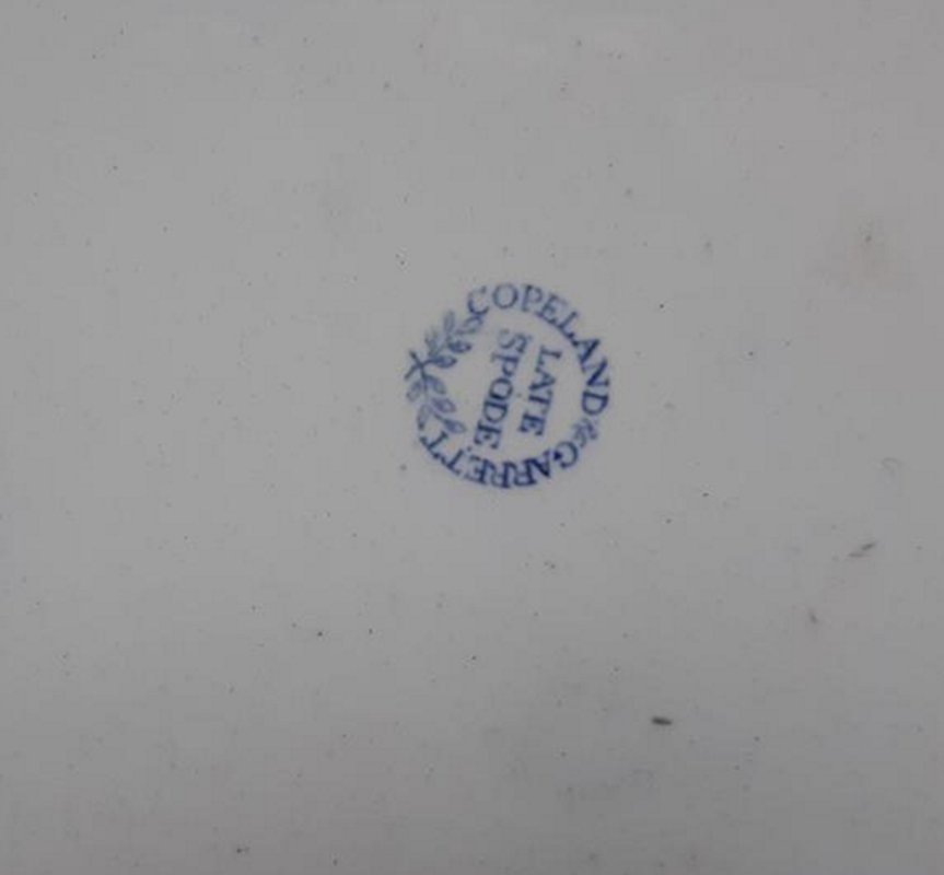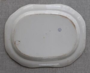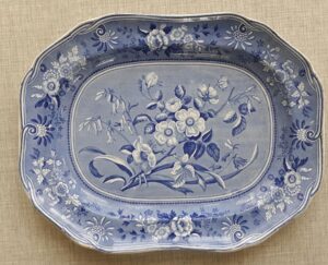 A blue and white transfer printed platter by Copeland & Garrett, circa 1835, from their “Botanical Series” , decorated with a large display of flowers. It measures 16.75″ long by 13″ wide. It has both an impressed and a printed maker’s mark. Nice condition, no damage noted.