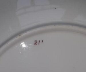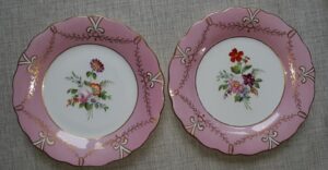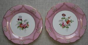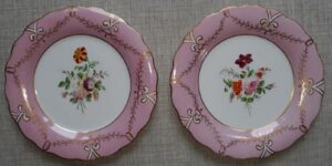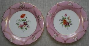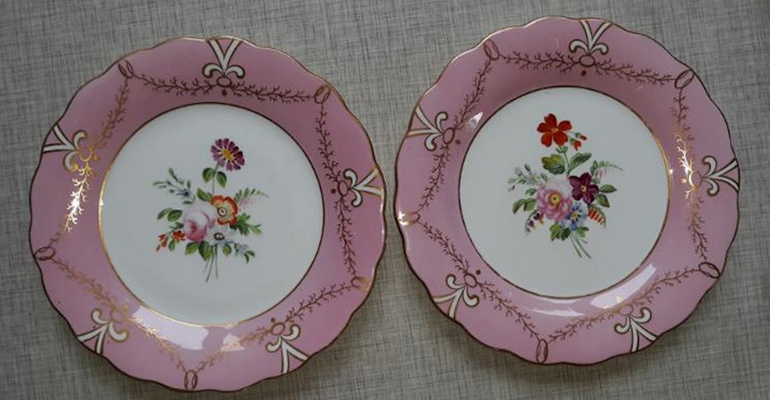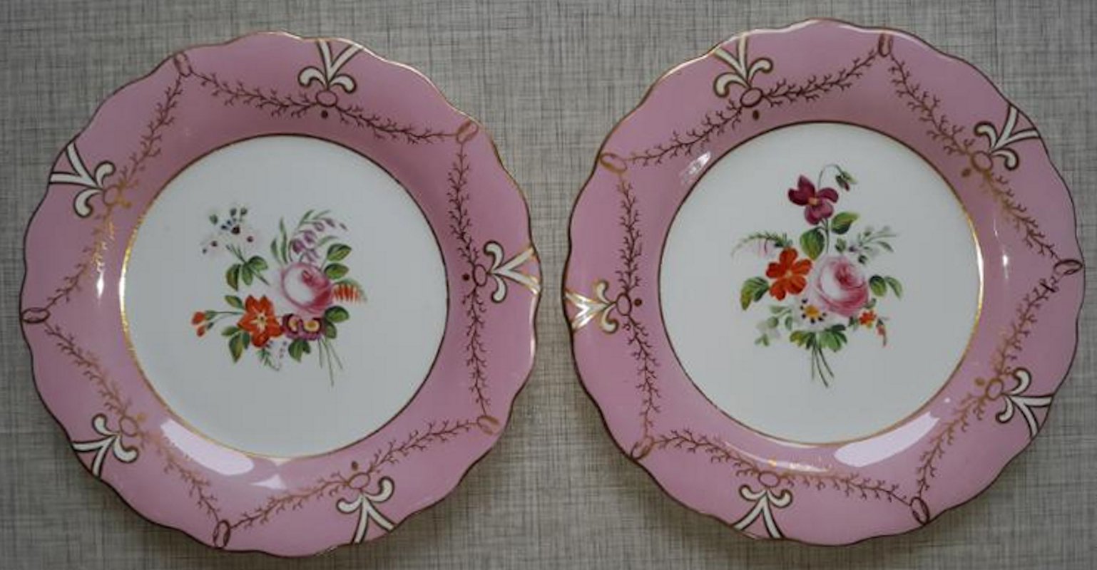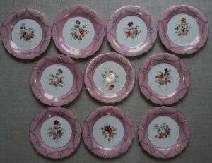 A set of ten 19th Century porcelain plates, hand painted in enamels, each with a different central flower spray within a pink and gilt border, They measure 9 inches in diameter. Each plate shows pattern number “211”. There is no maker’s mark. Nice condition, no damage noted.