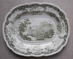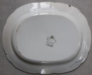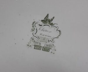 A very large green transfer-printed oval platter showing a Chinese landscape pattern described as “OPAQUE CHINA CHINESE MARINE”. It measures 20.75″ long by 16.5″ wide. Circa 1850. These pattern were introduced by Minton but copied later by several potters. The pieces were marked with a cartouche containing the pattern name and a maker’s initial. Minton pieces were printed with an “M”. This piece shows a “G” so it was probably made by Belle View pottery, in Hull. It has two small edge chips on the back edge which are not visible from the front. No other damage noted.