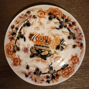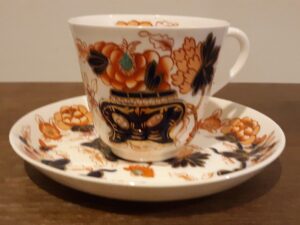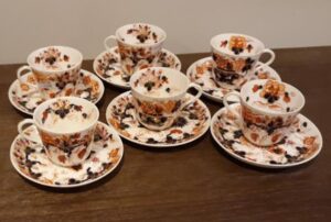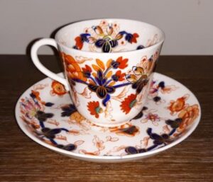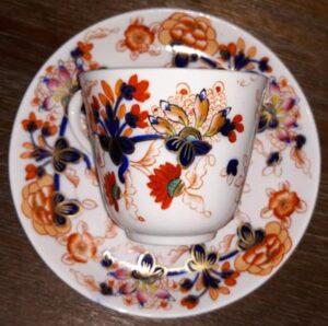 A set of six Coalport small cups and saucers, decorated in an Imari pattern, C1860. The saucers measure 5.5″ in diameter and the cup measure 3″ across the top and stand 2.5″ high. Each piece has a printed “Coalport AD 1790” mark. All in nice condition, no damage noted.