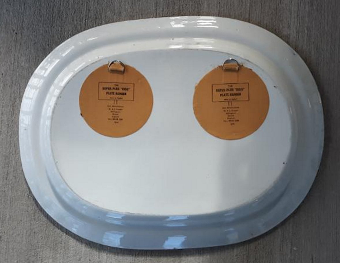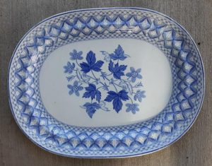A very large Spode blue and white transfer printed platter, decorated in the Jasmine pattern. It measures 23.25″ long and 17.25″ wide. Circa 1825. It has a blue printed SPODE mark on the rear which is concealed by a pair or hanging pieces which are stuck onto the back. (These can easily be removed by soaking). It is in nice clean condition with no noted damage.