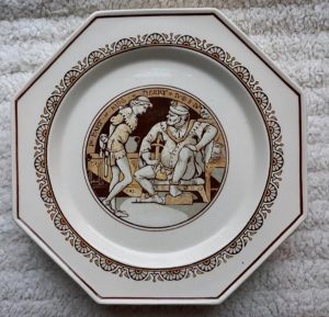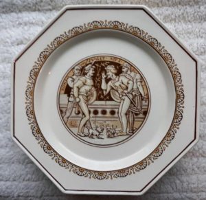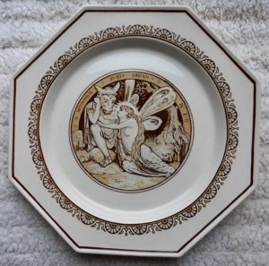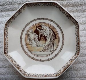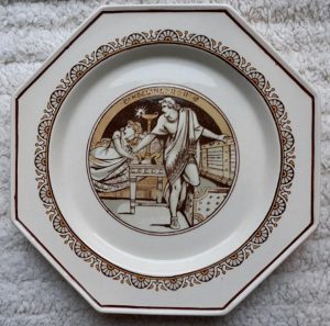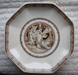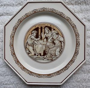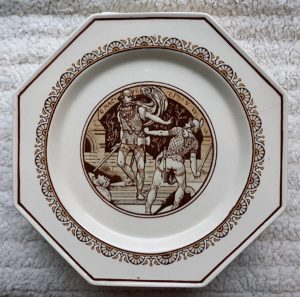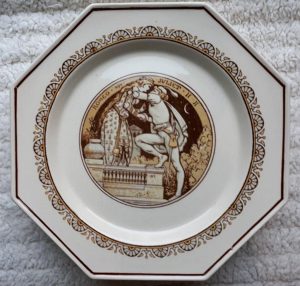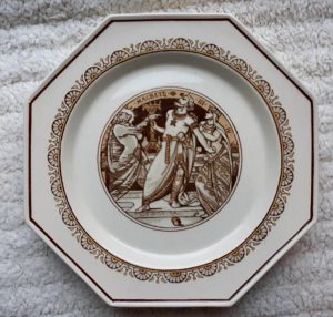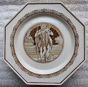 A Minton cream colored part dessert service in octagonal form, decorated with scenes from Shakespeare’s plays, John Moyr Smith the artist. Circa 1880. It consists of ten plates and three comports, each measuring 9.5″ at their widest. Each pieces has an impressed “MINTON” mark on the rear. One plate has a 1.5″ hairline crack on its edge. All the other pieces are in good condition.