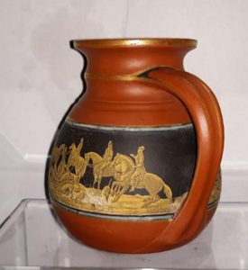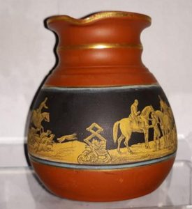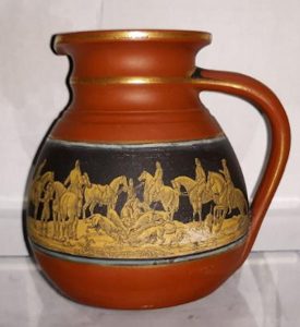 B630g A Prattware 4″ Terracotta Jug with Fox Hunt Scenes