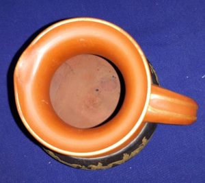 A prattware terracotta jug featuring fox hunt scenes. Circa 1840-60. It measures 4″ high and 4.5″ at its widest. Made by F and R Pratt of Fenton Staffordshire. There is an impressed mark on the base “F & R Pratt and Co” and “30H”.