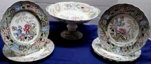 A Minton fluted and green printed earthenware dessert service with Chinese flowers and a fence picked out in enamels, C 1840. It comprises of a comport and five dessert plates, The comport stands 6″ high and the top is 11″ across handles. The plates measure 9″ diameter. They show an impressed “improved stone china” mark with a printed “M” and pattern 962 . Good condition, no damage noted.