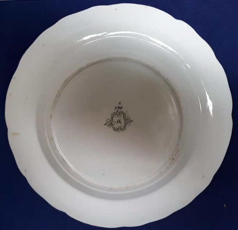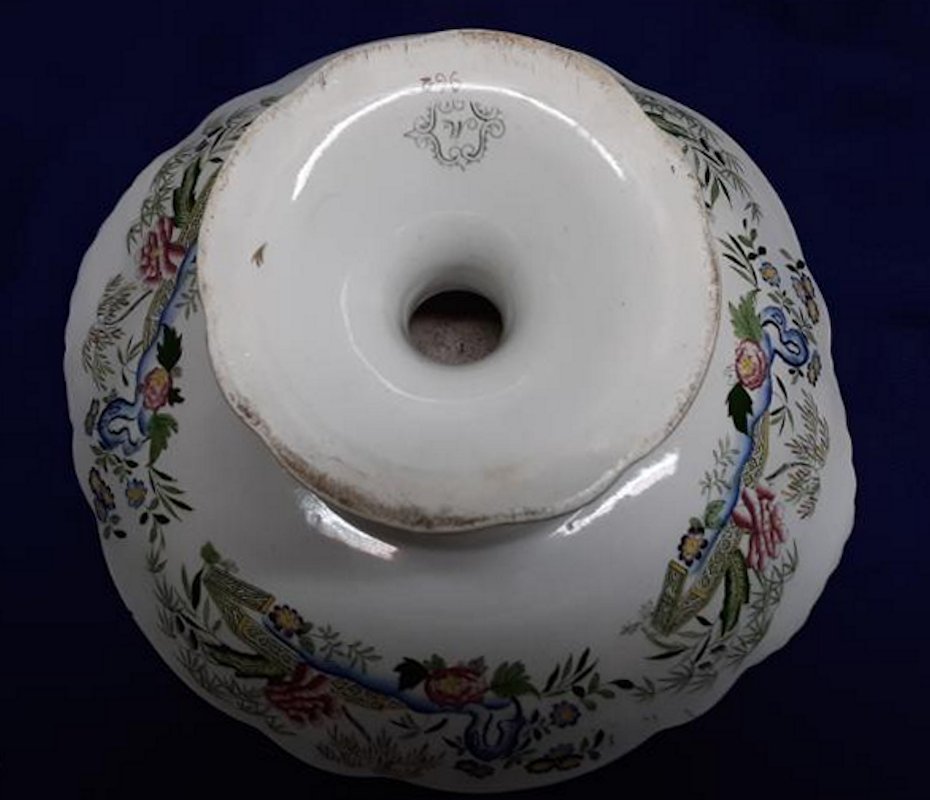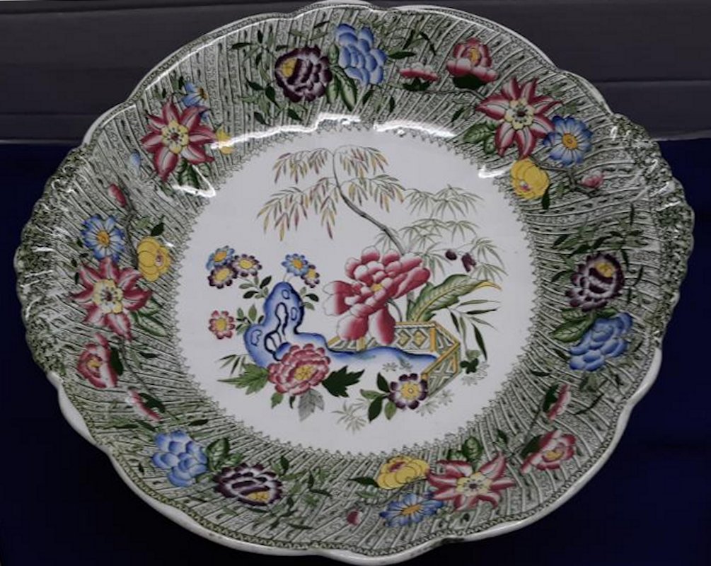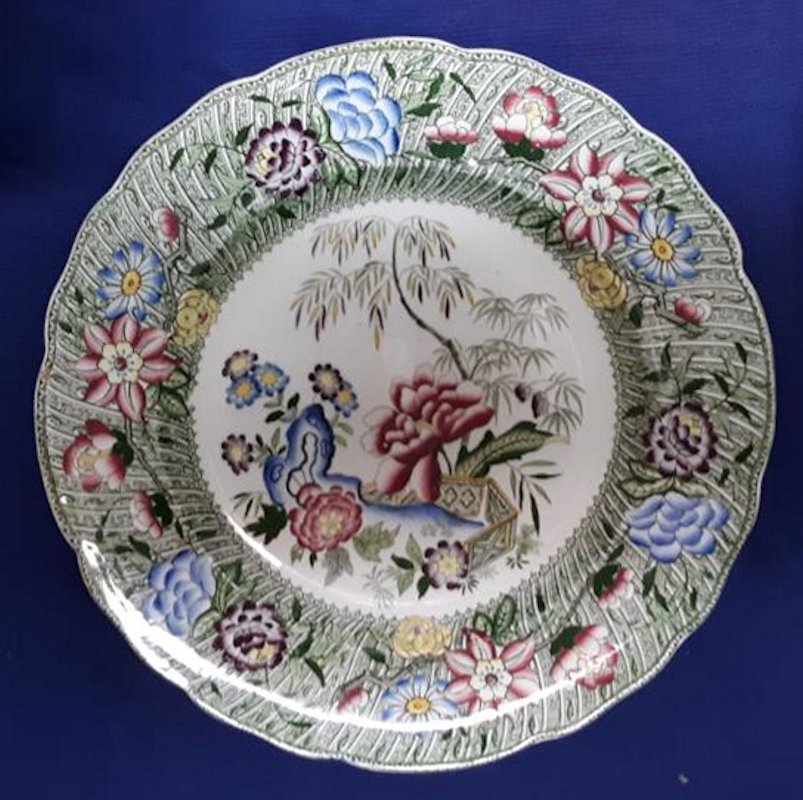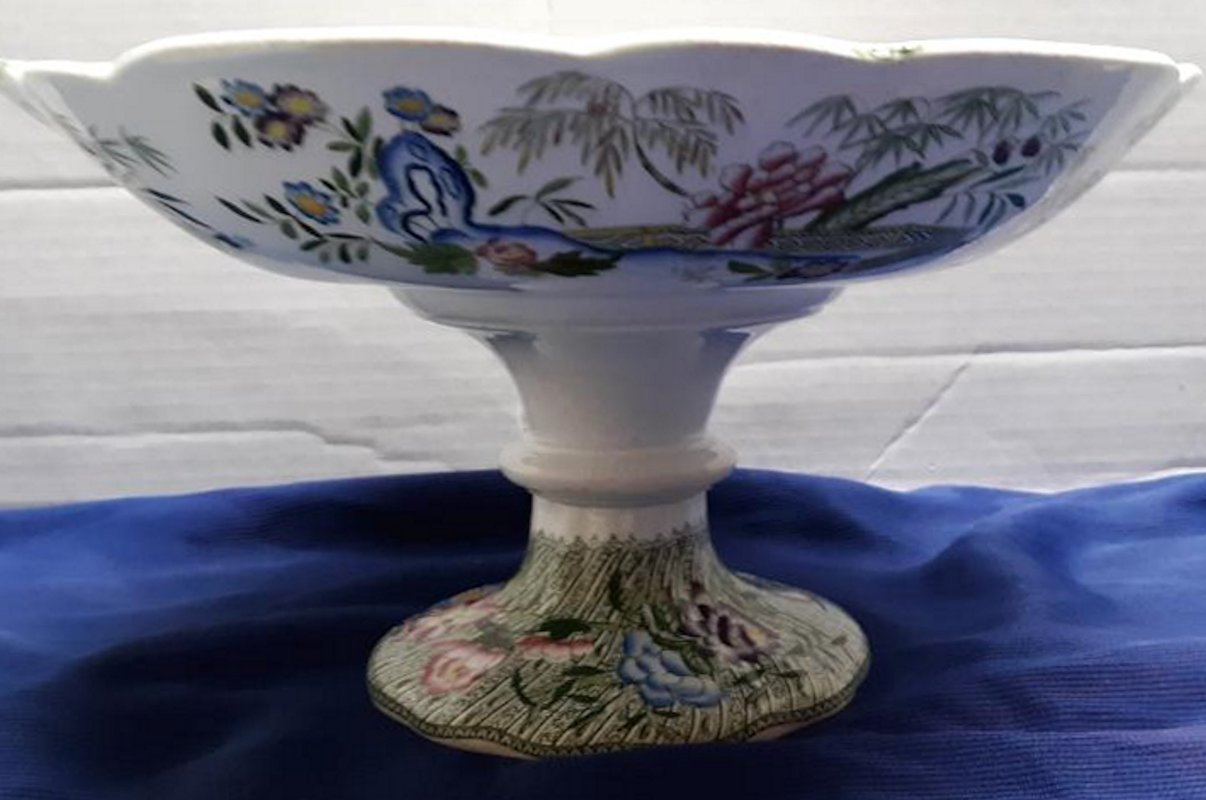 A Minton fluted and green printed earthenware dessert service with Chinese flowers and a fence picked out in enamels, C 1840. It comprises of a comport and five dessert plates, The comport stands 6″ high and the top is 11″ across handles. The plates measure 9″ diameter. They show an impressed “improved stone china” mark with a printed “M” and pattern 962 . Good condition, no damage noted.